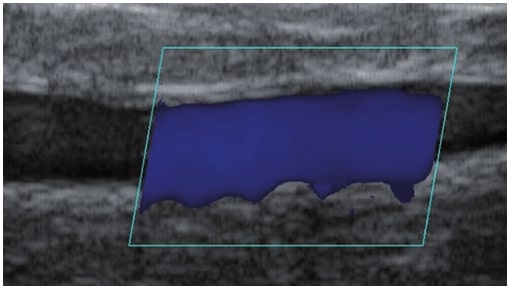 La ecografía Doppler permite obtener imágenes de grandes vasos y perforantes que suelen estar situados en las capas más profundas del tejido subcutáneo (fig. 1). Desgraciadamente, la ecografía convencional no es capaz de obtener imágenes de vasos más pequeños. Para visualizar los vasos más pequeños situados cerca de la superficie de la epidermis y en la capa superior del tejido subcutáneo, se utiliza el HFU (fig. 1). Gracias al uso de transductores con frecuencias superiores a 20 MHz, se obtiene una imagen ecográfica de alta resolución en la que podemos diferenciar estructuras menores de 0,1 mm. Sin embargo, cuanto mayor es la resolución, menor es la penetración del haz de ultrasonidos en las capas de la piel. Por lo tanto, dependiendo del transductor y del aparato, es posible penetrar en la piel hasta una profundidad de 20-30 mm como máximo. Tal penetración, junto con la alta resolución de la imagen, permite la evaluación incluso de vasos sanguíneos muy pequeños (fig. 2). Durante el examen con el uso de transductores de alta frecuencia, se puede evaluar con precisión el curso y la ubicación de los pequeños vasos en la piel. Esto es particularmente relevante para la selección del método de cierre del vaso y la planificación del procedimiento ya que, en la práctica, la superficie de la piel muestra muy a menudo únicamente un pequeño número de vasos o un ligero fragmento de un vaso; solo tras el examen por ecografía podemos determinar su número y curso reales. Para un cierre eficaz del vaso, es necesario hacerlo en toda su longitud. No debe limitarse al fragmento visto «a simple vista» en la superficie de la piel, ya que el cierre del fragmento causará su rápida recanalización(7). Con frecuencia, el vaso visible en la superficie de la piel cambia su curso, se vuelve más tortuoso y se desplaza a las capas más profundas de la piel(8). Por lo tanto, el curso de la vena y las perforantes deben conocerse y determinarse bien antes del procedimiento. El HFU también permite obtener imágenes de las perforantes entre pequeños vasos. Además, aparte de la evaluación del curso y la anatomía, la imagen ecográfica, gracias al software de ultrasonidos, también permite determinar los parámetros básicos como el diámetro del vaso, el grosor de su pared, la profundidad en la piel así como la presencia o ausencia de perfusión en el interior del vaso(6) (fig. 3). Gracias al transductor electrónico multielemento con la frecuencia de 40 MHz introducido en el mercado por Ultrasonix, también es posible visualizar la perfusión en los vasos en el modo Doppler color (fig. 4).