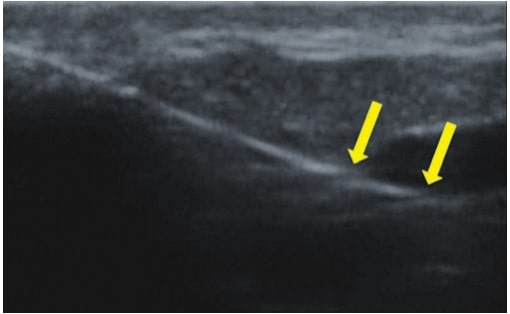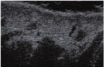 La escleroterapia es una técnica de cierre de vasos como resultado de inyectarles un esclerosante químico. En la actualidad, se aplica habitualmente y se caracteriza, sobre todo, por sus bajos costes y por el hecho de que es relativamente fácil de realizar. La escleroterapia está indicada principalmente para el cierre de venas reticulares mayores de 3 mm, pero también puede aplicarse si los vasos son más pequeños(10). En el caso de vasos menores de 3 mm, es más difícil introducir una aguja en su luz, lo que aumenta el riesgo de complicaciones(7). En tal situación, el HFU resulta de gran ayuda. Permite visualizar con precisión el curso del vaso y, posteriormente, facilita la realización del procedimiento con guía ecográfica (fig. 6). Así, gracias a la ultrasonografía, se ha eliminado el riesgo de administrar el esclerosante fuera de la luz del vaso, lo que conlleva necrosis. La imagen por ultrasonidos de alta frecuencia también puede utilizarse para monitorizar la eficacia del procedimiento.