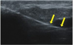 El procedimiento microendovascular es una técnica endovenosa que se utilizó principalmente para el tratamiento de la insuficiencia de grandes venas del sistema superficial y que se ha adaptado para venas más pequeñas. Actualmente se utiliza en el cierre de venas reticulares y telangiectasias. El procedimiento consiste en insertar una fibra óptica láser estéril e inducir la coagulación de los vasos como resultado de la energía láser(7,11). Requiere la guía por ultrasonidos de alta frecuencia. Gracias a la imagen ecográfica, es posible evaluar el curso y la anatomía del vaso, la inserción precisa de la fibra óptica en los vasos (fig. 7), la coagulación del vaso y la eficacia del procedimiento.